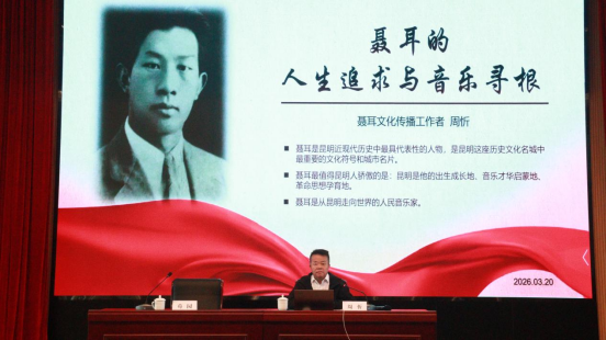 开幕式第三项议程,原昆明市文化局局长周忻老师以“聂耳的人生之路与音乐寻根”为主题进行学术讲座,周忻老师从聂耳的求学经历、思想觉醒、音乐创作、革命实践等多个维度,深入解读了聂耳“为人民而歌、为时代发声”的初心使命,生动展现了聂耳在民族危亡之际,以音乐为武器、唤醒民众觉醒的家国担当,为在场师生带来一场深刻的红色精神洗礼。